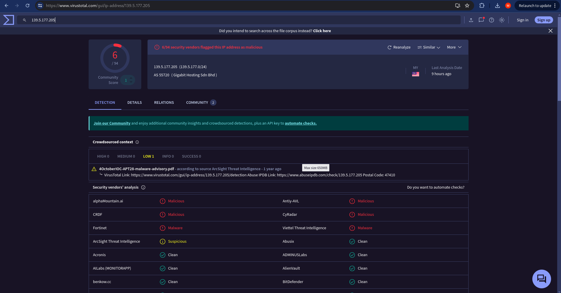 My first approach was to look up the IP address, which led me to a monument in Kuala Lumpur. After the author clarified that we should look for the APT group related to this IP address, I checked VirusTotal and found the APT group:
